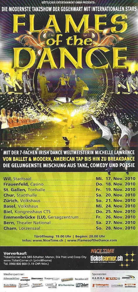 Folglich gehört "Flames of the Dance" zu den modernsten grossen Tanzshows unserer Ära. Die Show vereint erstklassige, international renommierte Künstler. Aufgrund dieses Talents wurde unser Ensemble beauftragt, drei Trailer für ZDFs neue Staffel von "Musical Star 2008" mit Thomas Gottschalk zu produzieren, wobei es sowohl für die Choreografie als auch für deren Aufführung verantwortlich war.